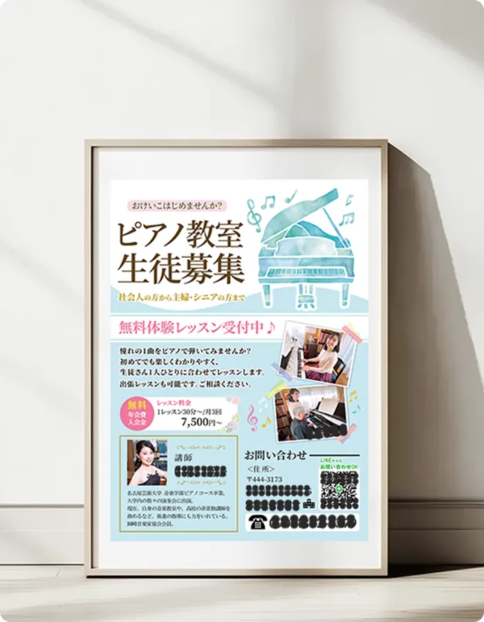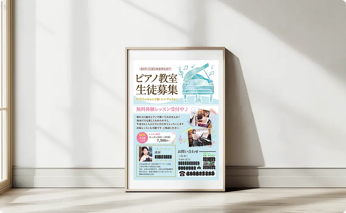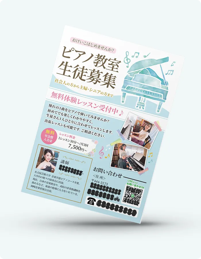 また、教室の住所や連絡先、QRコードを大きめに配置することで、地域の方が安心してお問い合わせいただけるよう配慮しました。