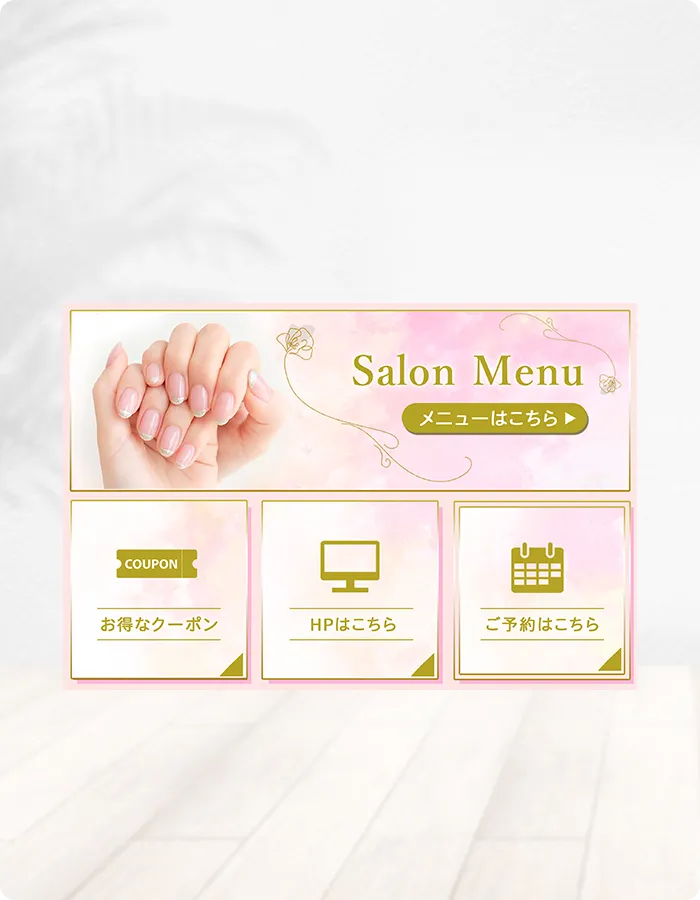 ネイルの写真を大きく配置することで視覚的な魅力を高め、季節に合わせて上部メインメニューの写真を変更する案もご提案し、来店促進につながる工夫を施しています。